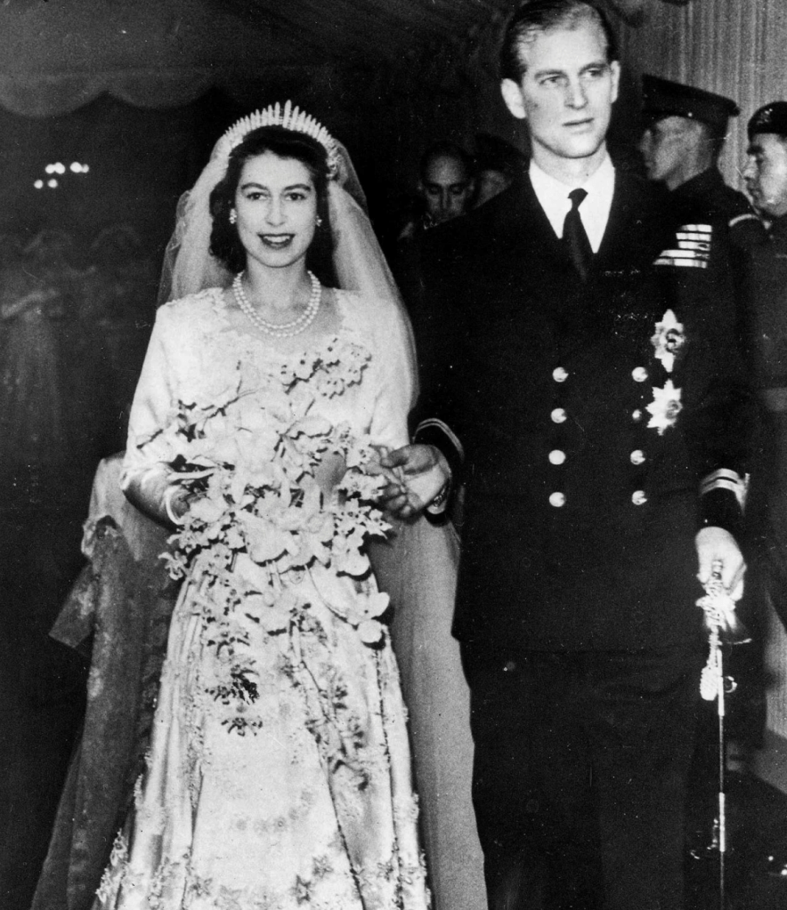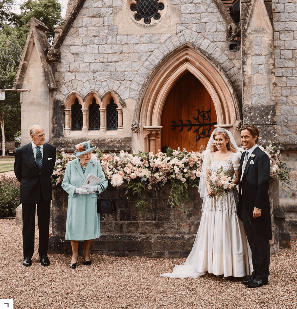 One photo shows the bride and groom exiting All Saint’s Chapel in Windsor Great Park, a short drive from Windsor Castle. Beatrice, 31, wore two extraordinary pieces on loan from the closet of her 94-year-old grandmother, Queen Elizabeth: a vintage ivory Peau de Soie taffeta dress by Norman Hartnell — the designer who famously crafted Elizabeth’s own WWII-era wedding gown — and the Queen Mary diamond fringe tiara, which was worn by the Queen on her 1947 wedding day to Prince Philip, 99.